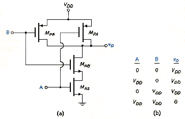 If the input signals A = B = logic 1 = , then both PMOS transistors are cut off, and the current in the circuit is zero. With A = logic 1, is in conducting state; however, since the current is zero, then of is zero. This means that the gate-to-source voltage of is also VDD and is also in a conducting state. However, since the current is zero, then of is zero, and = logic 0 = 0 V. The NAND logic function is shown in the truth table in [link]b.