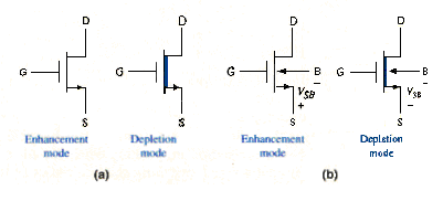[link]a shows the simplified circuit symbols for the n-channel enhancement and depletion-mode devices. When we explicitly consider the body or substrate connection, we will use the symbols shows in [link]b.