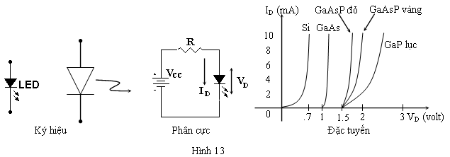 Để có ánh sáng liên tục, người ta phân cực thuận LED. Tùy theo vật liệu cấu tạo, điện thế thềm của LED thay đổi từ 1 đến 2.5V và dòng điện qua LED tối đa khoảng vài mA.