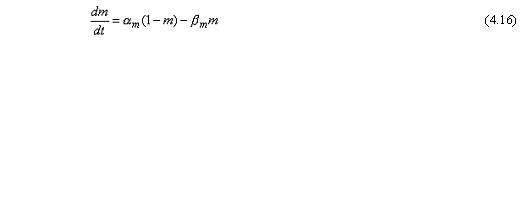 Dạng toán học cho sự biến đổi phụ thuộc thời gian và phụ thuộc điện áp của các phần tử m giữa trạng thái mở và đóng cũng gần giống với K. Ta định nghĩa những điều này với ký hiệu “m”; vì vậy hệ số tốc độ truyền đạt phụ thuộc điện áp là αm và βm. Ta có quá trình bậc nhất sau: