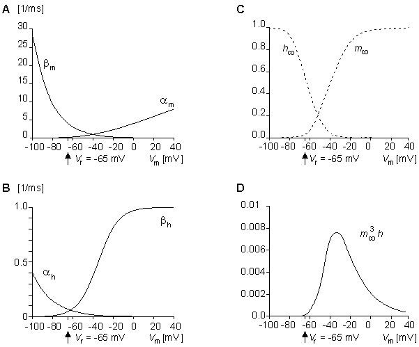 Bởi vì hằng số thời gian τm nhỏ hơn τh, m tăng đến một giá trị đồng nhất cực đại nhanh hơn h giảm về không. Cả hai tham số đều tuân theo hàm số mũ (tiếp theo động năng bậc 1) như quan sát trên hình 4.16C. Khi 3 phần tử m xuất hiện tại vị trí xung quanh kênh bên trong màng tế bào và một phần tử h xuất hiện tại vị trí bên ngoài màng tế bào thì kênh mở ra. Do đó ban đầu quá trình tăng độ dẫn của Na, GNa , tỷ lệ với m³ (bởi vì ban đầu h lớn và các phần tử h không khử hoạt chiếm vị trí bên ngoài màng kênh mở.) Trong hình 4.16A, hằng số thời gian ngắn τm được biểu thị bởi sự mở gần như đồng thời của 2 kênh Na. Sau đó, do hằng số thời gian dài hơn là τh, các phần tử h khử hoạt rời khỏi mặt trong của màng, ngăn cản các kênh ion. Do đó, như biểu diễn trong phương trình 4.19, đáp ứng tổng của độ dẫn Na, GNa, tỷ lệ với m³h.