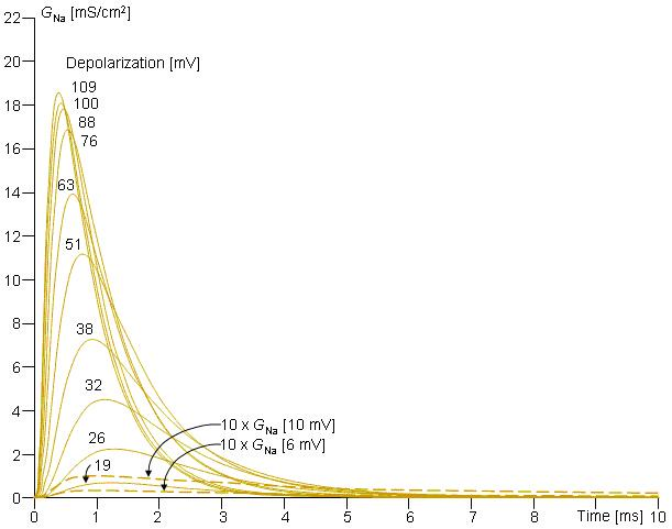 Sự biểu diễn độ dẫn Na ban đầu gần tương tự như của K, ngoại trừ tốc độ tăng của độ dẫn trong suốt quá trình khử cực nhanh hơn khoảng 10 lần. Có thể thấy rõ độ dẫn Na tăng trước sự tăng độ dẫn của K. Hodgkin và Huxley lại giả sử rằng các hạt mang điện ở kênh Na được gọi là các phần tử m tồn tại ở các vị trí điều khiển sự mở kênh. Vì vậy chúng có hai trạng thái, mở (cho phép) và đóng (không cho phép); m diễn tả tỷ lệ hạt ở trạng thái mở (ví dụ như ở bên trong màng) và (1 – m) là tỷ lệ hạt ở trạng thái đóng (ví dụ ở bên ngoài màng), trong đó 0 ≤ m ≤1.