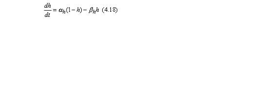 Tiếp sau một nấc điện áp khử cực (kẹp điện áp), m sẽ tăng theo thời gian (từ m0 đến m∞) dựa trên biểu thức như phương trình 4.14 (thay m cho n). Cách hoạt động của h chỉ là ngược lại vì trong trường hợp này nó sẽ được tìm ra khi h0 >> h∞ và một kết quả giảm theo hàm mũ từ sự khử cực. Vì vậy toàn bộ các đáp ứng đối với mức điện áp khử cực bao gồm cả sự tăng theo hàm mũ của m (sự tăng lên theo đường xichma đối với m³) và sự suy giảm theo hàm mũ của h, vì vậy GNa được biểu thị như trong hình 4.19 với đoạn đầu tăng và đoạn sau giảm. Cách hoạt động này là để phù hợp với các dữ liệu trong hình 4.14. Thêm vào đó ta quay trở lại giá trị lúc nghỉ bình thường của m gần sát không, trong khi h xấp xỉ 0.6. Đối với trạng thái siêu phân cực lúc đầu thì hiệu ứng là để giảm m; tuy nhiên vì nó rất nhỏ nên sự suy giảm có thể xảy ra. Đối với h thì giá trị của nó tăng tới giá trị đồng nhất, và ảnh hưởng đến sự khử cực rất rõ ràng. Ảnh hưởng này hoàn toàn phù hợp với các quan sát thực nghiệm. Hằng số thời gian đối với sự biến đổi h dài hơn đáng kể so với m và n, có thể dẫn đến hiện tượng “ngắt dương cực”, sẽ được nói đến ở phần cuối chương này. Hình 4.15A biểu diễn sự thay đổi hệ số tốc độ di chuyển αm, βm, αh, và βh theo điện áp màng tế bào. Hình 4.15B biểu diễn sự thay đổi của m∞ , h∞ , và m∞³h∞ theo điện áp màng tế bào.