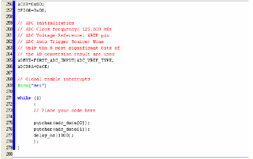 Khởi tạo bằng CodeWinzard AVR cho cổng nối tiếp USART hoạt động, cho phép ADC hoạt động(interrupt) như các bài trước sau đó viết code cho hàm main như sau: