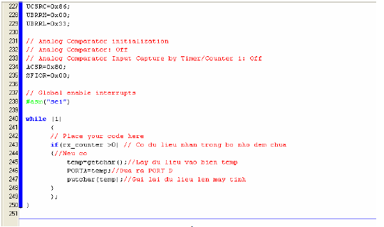 Khởi tạo trong CodeVision AVR cho phép cổng nối tiếp hoạt động, PORTD là out put như các bài trước đã học. Sau đó lập trình cho hàm main như sau: