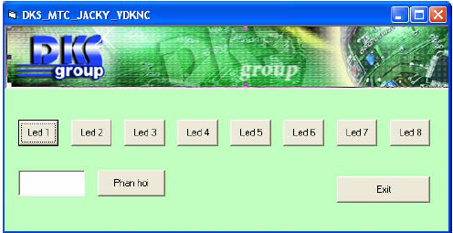 Trong FORM có: 1 đối tượng picturebox chứa logo của DKS. Có 10 đối tượng button trong đó 8 đối tượng button Led1...Led8 là một mảng button có tên từ Command1(0) ... Command1(7). Muốn tạo một mảng button ta chỉ việc lấy ra 8 đối tượng button và sửa tên tất cả chúng thành Command 1. Hai button còn lại là Phản hồi và Exit. Có một textbox để hiển thị dữ liệu phản hồi.