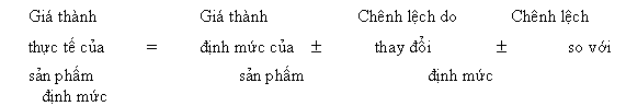 Trên cơ sở hệ thống định mức tiêu hao lao động, vật tư hiện hành và dự toán về chi phí sản xuất chung, kế toán sẽ xác định giá thành định mức của từng loại sản phẩm. Đồng thời hạch toán riêng các thay đổi, các chênh lệch so với định mức phát sinh trong quá trình sản xuất sản phẩm và phân tích toàn bộ chi phí thực tế phát sinh trong kỳ thành 3 loại: theo định mức, chênh lệch thay đổi định mức và chênh lệch so với định mức. Từ đó tiêna hành xác định giá thành thực tế như sau:
