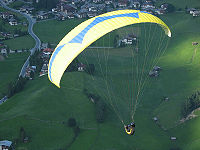 - Khi gió thổi trực diện vào một vách núi, không khí chuyển hướng từ dưới lên trên tạo lực nâng theo dòng không khí giúp dù duy trì độ cao, lực nâng theo vách núi này không thể đưa dù lên cao như kiểu nâng theo cột khí nóng. Được gọi là bay theo vách núi (ridge soaring)