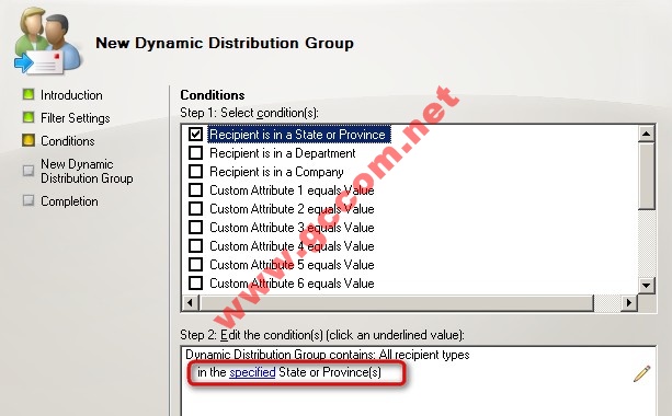 Tại màn hình Conditions chọn Recipient is in a State or Province (bởi vì trước đó ta đã đặt thuộc tính của các User theo State/Province)