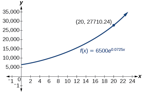 [link] represents the graph of the equation. On the graph, the x-coordinate of the point at which the two graphs intersect is close to 20. In other wordsA calculator gives a better approximation: