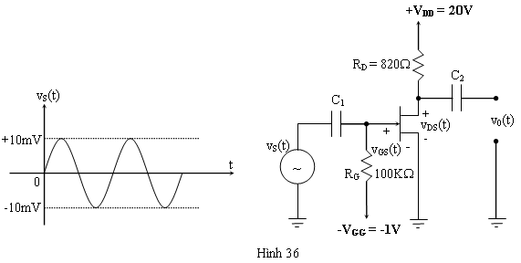 Giả sử ta áp một tín hiệu xoay chiều hình sin vs(t) có biên độ điện thế đỉnh là 10mV vào ngõ vào của một mạch khuếch đại cực nguồn chung dùng JFET kênh N
