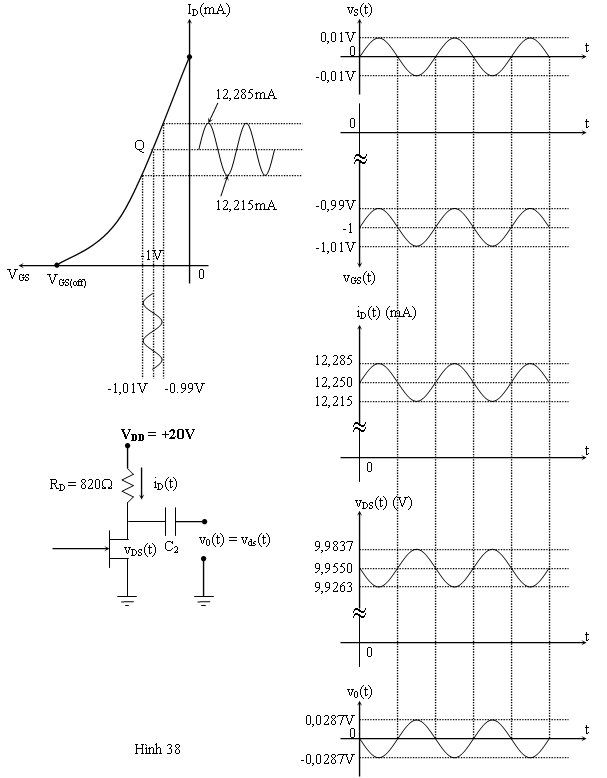 Nguồn tín hiệu có điện thế đỉnh nhỏ nên điện thế cổng nguồn vẫn luôn luôn âm. Nhờ đặc tuyến truyền, chúng ta thấy rằng điểm điều hành sẽ di chuyển khi VGS thay đổI theo tín hiệu. Ở thời điểm khi VGS ít âm hơn, dòng thoát iD(t) tăng và khi VGS âm nhiều hơn, dòng thoát iD(t) giảm. Vậy dòng điện thoát iD(t) thay đổi cùng chiều với vGS(t) và có trị số quanh dòng phân cực ID tỉnh (được giả sử là 12,25mA). Độ gia tăng của iD(t) và độ giảm của iD(t) bằng nhau với tín hiệu nhỏ (giả sử là 0,035mA). (Xem hình trang sau).