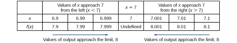 Values described as “from the left” are less than the input value 7 and would therefore appear to the left of the value on a number line. The input values that approach 7 from the left in [link] are andThe corresponding outputs are andThese values are getting closer to 8. The limit of values ofasapproaches from the left is known as the left-hand limit. For this function, 8 is the left-hand limit of the functionasapproaches 7.