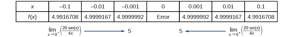 To create the table, we evaluate the function at values close toWe use some input values less than 5 and some values greater than 5 as in [link]. The table values show that whenbut nearing 5, the corresponding output gets close to 75. Whenbut nearing 5, the corresponding output also gets close to 75.