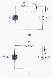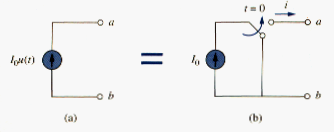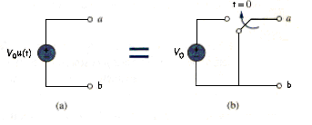 If we let , then v(t) is simply the step voltage . A voltage source of is shown in [link](a); its equivalent circuit is shown in [link](b). It is evident in [link](b) that terminals a-b are short circuited (v = 0) for t < 0 and that appears at the terminals for t > 0. Similarly, a current source of is shown in [link](a), while its equivalent circuit is in [link](b). Notice that for t < 0, there is an open circuit (i = 0), and that flows for t > 0.