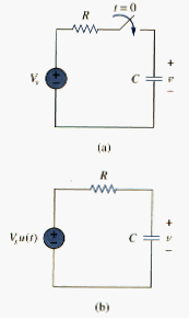 Consider RC circuit in [link](a) which can be replaced by the circuit in [link](b), where is a constant, dc voltage source. Again, we select the capacitor voltage as the circuit response to be determined. We assume an initial voltage on the capacitor, although this is not necessary for the step response. Since the voltage of a capacitor cannot change instantaneously,