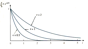The natural response is illustrated graphically in [link]. Note that at t = 0, we have the correct initial condition as in [link]. as t increases, the voltage decreases toward zero. The rapidity with which the voltage decreases is expressed in terms of the time constant, denoted by , the lower case greek letter tau.