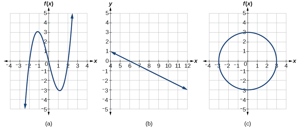 For the following exercises, use the vertical line test to determine which graphs show relations that are functions.