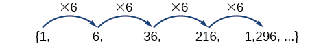 The yearly salary values described form a geometric sequence because they change by a constant factor each year. Each term of a geometric sequence increases or decreases by a constant factor called the common ratio. The sequence below is an example of a geometric sequence because each term increases by a constant factor of 6. Multiplying any term of the sequence by the common ratio 6 generates the subsequent term.