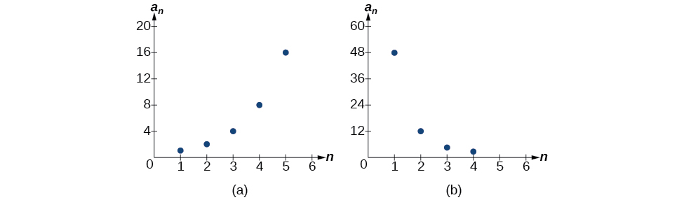 The graph of each sequence is shown in [link]. It seems from the graphs that both (a) and (b) appear have the form of the graph of an exponential function in this viewing window. However, we know that (a) is geometric and so this interpretation holds, but (b) is not.
