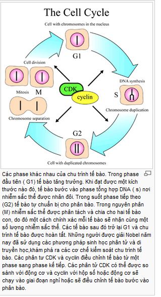 Các phase khác nhau của chu trình tế bào. Trong phase đầu tiên ( G1) tế bào tăng trưởng. Khi đạt được một kích thước nào đó, tế bào bước vào phase tổng hợp DNA ( s) nơi nhiễm sắc thể được nhân đôi. Trong suốt phase tiếp theo (G2) tế bào tự chuẩn bị cho phân bào. Trong nguyên phân (M) nhiễm sắc thể được phân tách và chia cho hai tế bào con, do đó một cách chính xác mỗi tế bào sẽ nhận cùng một số lượng nhiễm sắc thể. Các tế bào sau đó trở lại G1 và chu trình tế bào được hoàn tất. Những người được giải Nobel năm nay đã sử dụng các phương pháp sinh học phân tử và di truyền học,khám phá ra các cơ chế kiểm soát chu trình tế bào. Các phân tư CDK và cyclin điều chỉnh tế bào từ một phase sang phase kế tiếp. Các phân tử CDK có thể được so sánh với động cơ và cyclin với hộp số hoặc động cơ sẽ chạy vào giai đoạn nghỉ hoặc sẽ điều chỉnh tế bào bước vào phân bào.