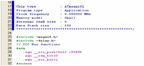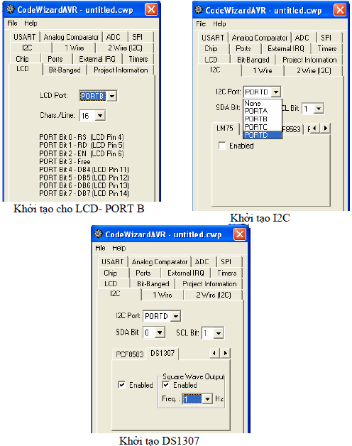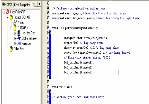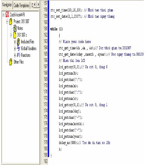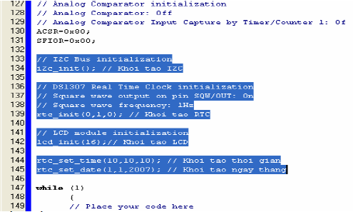 Ngay trước vòng while(1) trong hàm main bổ xung câu lệnh đặt thời gian và ngày tháng cho RTC. I2C, DS1307, LCD đã khởi tạo bằng CodeWinzard AVR.