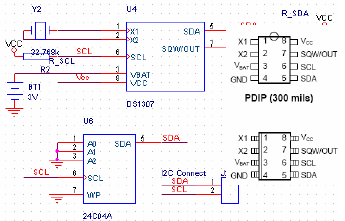 Bus của I2C từ DS1307 và 24Cxx được nối với một jumper giúp ta có thể nối với bất kỳ 2 bít của hai cổng bất kỳ của AVR trên KIT bởi một dây nối.