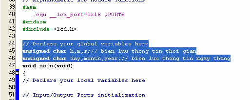 Chúng ta phải khai báo 3 biến để lưu thông tin về thời gian là giờ h; phút m; giây s và 3 biến lưu thông tin về ngày tháng là ngày day; tháng month; năm year ngay phía trước hàm main như sau: