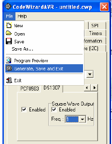 Trong tab các chip ta chọn chíp DS1307, check vào Enabled để xác định sử dụng DS1307 và trong ô Square Wave Output ta check vào ô Enabled, trong list Freq: Chọn 1 Hz để khởi tạo cho chân output của DS1307 cứ 1 s có một xung ra, trong mạch chân đó nối với 1 led và khởi tạo vừa rồi làm cho led đó nhấp nháy với tần số 1 Hz. Sau đó chọn File → Save, Generate and Exit.