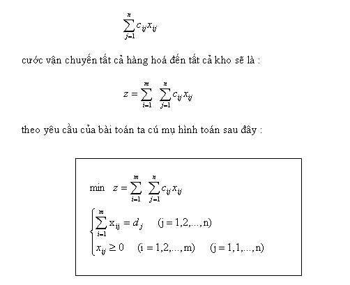 gọi xij ≥ 0 là lượng hàng hoá phải vận chuyển từ kho i đến cửa hàng j. cước vận chuyển chuyển hàng hoá i đến tất cả các kho j là :