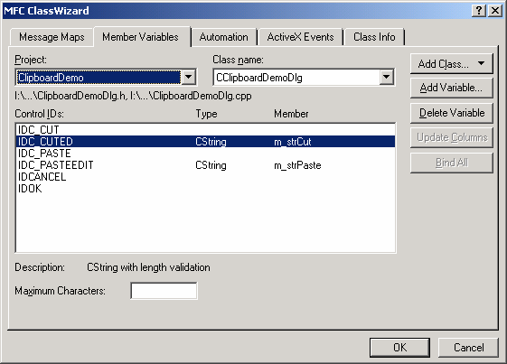 Lần lượt đặt tên biến cho hộp Copy và hộp Paste với tên biến lần lượt như hình dưới đây (sử dụng ClassWizard).