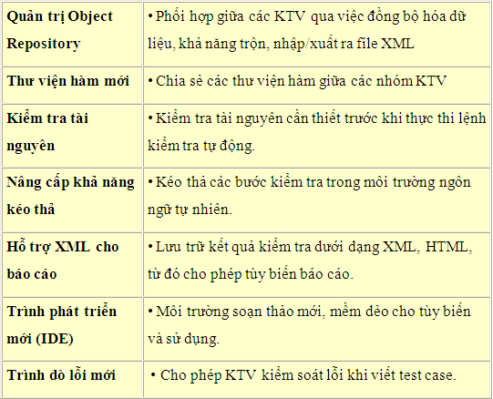 2. Đặc điểm • Dễ sử dụng, bảo trì, tạo test script nhanh. Cung cấp dữ liệu kiểm tra rõ ràng và dễ hiểu. • Kiểm tra phiên bản mới của ứng dụng với rất ít sự thay đổi. Ví dụ khi ứng dụng thay đổi nút tên "Login" thành "Đăng nhập", thì chỉ cần cập nhật lại Object Repository (OR - được giải thích ở phần sau) để QTP nhận ra sự thay đổi đó mà không cần thay đổi bất cứ test script nào. • Hỗ trợ làm việc theo nhóm thông qua sự chia sẻ thư viện, thống nhất quản lý Object Repository. • Thực tế cho thấy, QTP thực hiện KTTĐ trên nhiều trình duyệt cùng lúc tốt hơn những TT khác. • Với chức năng Recovery Scenarios, QTP cho phép xử lý những sự kiện hoặc lỗi không thể đoán trước có thể làm script bị dừng trong khi đang chạy. • QTP có khả năng hiểu test script của Mercury Winrunner (một công cụ kiểm tra khác của Mercury). Đặc biệt phiên bản v.8.2 có một số tính năng mới nổi bật: