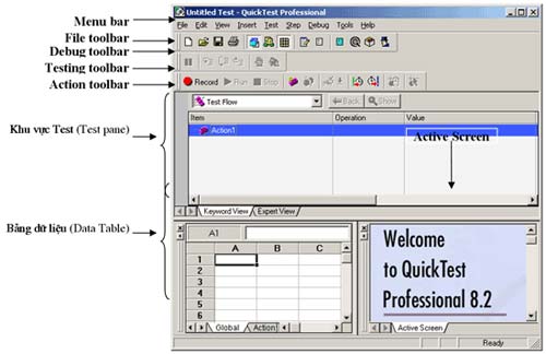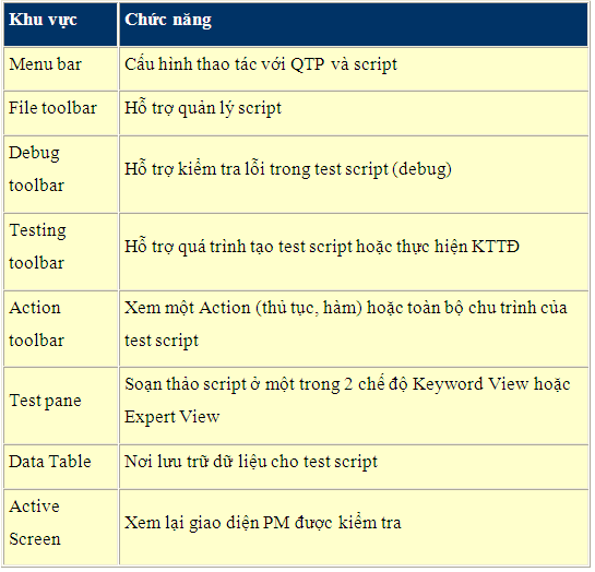 3. Các thành phần quan trọng trong QTP a. Action: Giống như thủ tục hay hàm trong các ngôn ngữ lập trình khác, Action ghi lại các bước thực hiện KTTĐ và nó có thể được sử dụng lại nhiều lần. Trong một test script có thể có nhiều Action. b. DataTable: Nơi lưu dữ liệu phục vụ cho KTTĐ. Một test script sẽ có một DataTable được dùng chung cho tất cả các Action. Bên cạnh đó mỗi Action cũng có một DataTable cho riêng mình. c. Object Repository (OR): Cấu trúc theo dạng cây, mô tả các đối tượng trong PM được kiểm tra. Đây được xem là cầu nối để test script tương tác với PM được kiểm tra. Khi ra lệnh cho QTP ghi lại thao tác người dùng lên PM thì trong OR sẽ tự động phát sinh thành phần đại diện cho những đối tượng trên PM vừa được thao tác. OR có thể tổ chức thành 2 loại, một loại dùng chung trong nhiều test script, loại khác dùng theo từng Action. Để xem OR, chọn menu Tools > Object Repository. d. Checkpoint: Có thể hiểu là nơi kiểm tra trong test script, khi chạy nó sẽ thực hiện so sánh kết quả thực tế khi kiểm tra PM với kết quả mong đợi. Sau khi tiến hành so sánh QTP sẽ tự động ghi lại kết quả vào Test Results (nơi lưu kết quả khi chạy test script). 4. Ngôn ngữ sử dụng viết script QTP sử dụng ngôn ngữ VBScript để viết test script. Đây là ngôn ngữ dễ học; rất giống ngôn ngữ VBA. Chế độ Expert View của QTP là chế độ soạn thảo dành cho VBScript. Ngoài việc dùng VBScript để tương tác với PM được kiểm tra, QTP còn có khả năng cấu hình hệ thống bằng ngôn ngữ Windows Script. Chi tiết về ngôn ngữ VBScript, người đọc có thể dễ dàng tìm trong các sách hiện có trên thị trường, thậm chí ngay chính trong phần help của QTP.