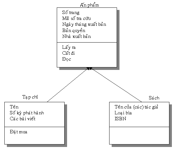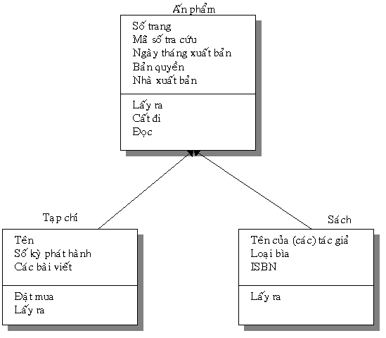 Ví dụ 1.2: Chúng ta sẽ xây dựng một tập các lớp mô tả cho thư viện các ấn phẩm. Có hai kiểu ấn phẩm: tạp chí và sách. Chúng ta có thể tạo một ấn phẩm tổng quát bằng cách định nghĩa các thành phần dữ liệu tương ứng với số trang, mã số tra cứu, ngày tháng xuất bản, bản quyền và nhà xuất bản. Các ấn phẩm có thể được lấy ra, cất đi và đọc. Đó là các phương thức thực hiện trên một ấn phẩm. Tiếp đó chúng ta định nghĩa hai lớp dẫn xuất tên là tạp chí và sách. Tạp chí có tên, số ký phát hành và chứa nhiều bài của các tác giả khác nhau . Các thành phần dữ liệu tương ứng với các yếu tố này được đặt vào định nghĩa của lớp tạp chí. Tạp chí cũng cần có một phương thức nữa đó là đặt mua. Các thành phần dữ liệu xác định cho sách sẽ bao gồm tên của (các) tác giả, loại bìa (cứng hay mềm) và số hiệu ISBN của nó. Như vậy chúng ta có thể thấy, sách và tạp chí có chung các đặc trưng ấn phẩm, trong khi vẫn có các thuộc tính riêng của chúng.