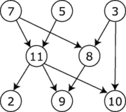 The graph shown to the left has many valid topological sorts, including: FIXME: A LIST CAN NOT BE A TABLE ENTRY. 7,5,3,11,8,2,10,97,5,11,2,3,10,8,93,7,8,5,11,10,9,23,5,7,11,10,2,8,9 |