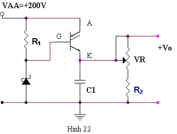 Khi cấp điện, GTO dẫn, anod và catod xem như nối tắt. C1 nạp điện đến điện thế nguồn VAA, lúc đó VGK<0 làm GTO ngưng dẫn. Tụ C1 xả điện qua R3=VR+R2. Thời gian xả điện tùy thuộc vào thời hằng τ=R3C1. Khi Vo<VZ, GTO lại dẫn điện và chu kỳ mới lại được lập lại.