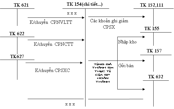 Sau khi đã tập hợp chi phí như là chi phí nguyên vật liệu trực tiếp, chi phí nhân công trực tiếp, chi phí sản xuất chung thì cuối kỳ hạch toán (tháng, quý) phải kết chuyển vào bên nợ của TK154 để phục vụ cho việc tính giá thành sản phẩm. TK 154 phải được mở chi tiết theo từng đối tượng tính giá thành.