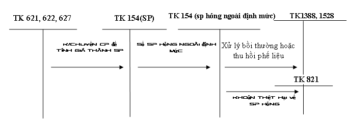 - Đối với sản phẩm hỏng trong định mức thì chi phí đó vẫn tính vào chi phí chung trong quá trình sản xuất sản phẩm. Còn đối với sản phẩm hỏng ngoài định mức thì phải hạch toán riêng vào TK 154 và được chi tiết theo sản phẩm hỏng ngoài định mức.