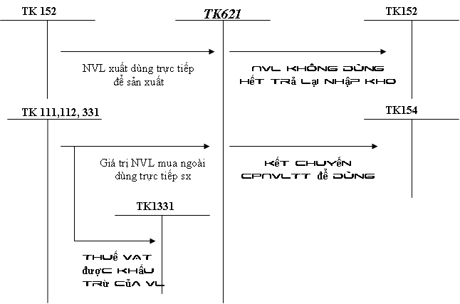 Để theo dõi các khoản chi phí nguyên vật liệu trực tiếp, kế toán sử dụng TK621- nguyên vật liệu trực tiếp. Tài khoản này được mở sổ chi tiết theo từng đối tượng tập hợp chi phí (phân xưởng, bộ phận sản xuất).