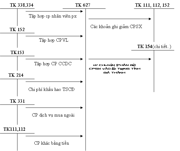 Trong kỳ tập hợp chi phí từ TK liên quan vào bên nợ TK627. Cuối kỳ phân ra các khoản ghi giảm chi phí và những TK liên quan, còn lại phân bổ chi phí sản xuất cho từng đối tượng kết chuyển vào TK 154 (doanh nghiệp áp dụng PPKKTX) hay vào TK 631 (doanh nghiệp áp dụng PPKKĐK
