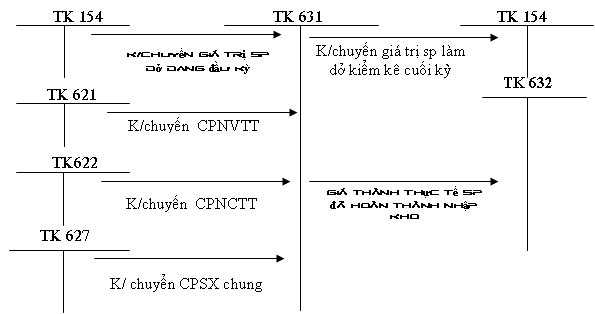 Theo phương pháp kiểm kê định kỳ thì kế toán sử dụng TK 631- Giá thành sản xuất. Kế toán vẫn sử dụng các TK621, 622, 627 để tập hợp chi phí và TK 154 nhưng TK 154 chỉ dùng để phản ánh số dư đầu kỳ và cuối kỳ. Bên nợ TK 631 tập hợp các chi phí NVLTT, CPNCTT, CPSXC và giá trị sản phẩm làm dở đầu kỳ chuyển sang. Cuối kỳ sau khi đã kiểm kê đánh giá sản phẩm làm dở cuối kỳ thì kết chuyển giá trị sản phẩm làm dở cuối kỳ từ TK 631 sang TK 154. Và trên cơ sở số dư đầu kỳ cộng chi phí tập hợp được trong kỳ trừ giá trị sản phẩm làm dở kiểm kê cuối kỳ thì sẽ tính được giá thực tế của sản phẩm hoàn thành nhập kho.