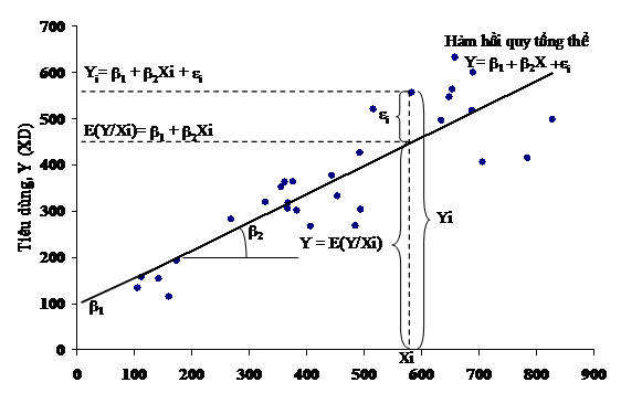 Trong phân tích hồi quy chúng ta xem biến độc lập X có giá trị xác định trong khi biến phụ thuộc Y là biến ngẫu nhiên. Điều này tưởng như bất hợp lý. Khi chúng ta chọn ngẫu nhiên người thứ i thì chúng ta thu được đồng thời hai giá trị: Xi là thu nhậpvà Yi là tiêu dùng của người đó. Vậy tại sao lại xem Yi là ngẫu nhiên? Câu trả như sau : Xét một mức thu nhậpXi xác định, cách lấy mẫu của chúng ta là chọn ngẫu nhiên trong số những người có thu nhậplà Xi. Thu nhậpgóp phần chính yếu quyết định tiêu dùng như thể hiện ở hàm số (1.3), tuy nhiên còn nhiều yếu tố khác cũng tác động lên tiêu dùng nên ứng với một cách lấy mẫu thì với nhiều lần lấy mẫu với tiêu chí X = Xi ta nhận được các giá trị Yi khác nhau. Vậy chính xác hơn biến phụ thuộc Y là một biến ngẫu nhiên có điều kiện theo biến độc lập X. Ước lượng tốt nhất cho Y trong trường hợp này là giá trị kỳ vọng của Y ứng với điều kiện X nhận giá trị Xi xác định.