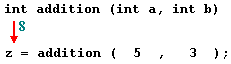 Các tham số có vai trò thật rõ ràng. Bên trong hàm main chúng ta gọi hàm addition và truyền hai giá trị: 5 và 3 tương ứng với hai tham số int a và int b được khai báo cho hàm addition.