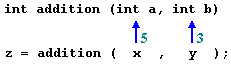 Chúng ta có thể thấy hàm main bắt đầu bằng việc khai báo biến z kiểu int. Ngay sau đó là một lời gọi tới hàm addition. Nếu để ý chúng ta sẽ thấy sự tương tự giữa cấu trúc của lời gọi hàm với khai báo của hàm: