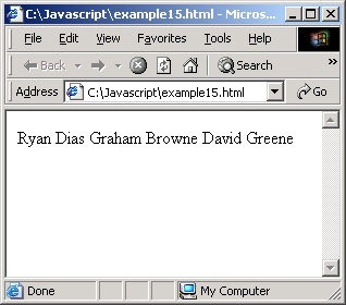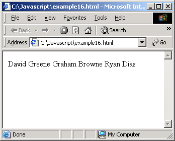 <html> <head> <script language="JavaScript"> <!-- emp = new Array(3) emp[0] = "Ryan Dias" emp[1] = "Graham Browne" emp[2] = "David Greene"; emp.sort(); document.writeln(emp[0]); document.writeln(emp[1]); document.writeln(emp[2]); //--> </script> </head> </html>Kết quả: