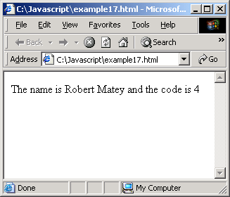 <HTML> <HEAD> <SCRIPT LANGUAGE = "JavaScript"> <!-- MyArray = new Array(5,5); MyArray[0, 0] = "Ryan Dias"; MyArray[0, 1] = 1; MyArray[1, 0] = "Mike Donne"; MyArray[1, 1] = 2; MyArray[2, 0] = "Joe Dean"; MyArray[2, 1] = 3; MyArray[3, 0] = "Robert Matey"; MyArray[3, 1] = 4; document.write ("The name is " + MyArray[3, 0]); document.write("and the code is " + MyArray[3,1]); --> </SCRIPT> </HEAD> </HTML>Kết quả: