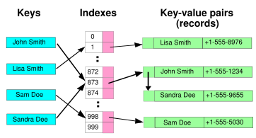 In computer science, a hash table, or a hash map, is a data structure that associates keys with values. The primary operation it supports efficiently is a lookup: given a key (e.g. a person's name), find the corresponding value (e.g. that person's telephone number). It works by transforming the key using a hash function into a hash, a number that is used to index into an array to locate the desired location ("bucket") where the values should be.