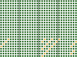 Each of the 24 rows corresponds to a single bit in the 3-byte input key, and each of the 32 columns corresponds to a bit in the output hash. Colors are chosen by how well the input key bit affects the given output hash bit: a green square indicates good mixing behavior, a yellow square weak mixing behavior, and red would indicate no mixing. Only a few bits in the last byte of the output hash are weakly mixed, a performance vastly better than a number of widely used hash functions.