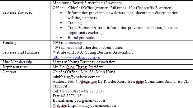 YBA provides a comprehensive range of services to its members including a website (www.ybahcm.com.vn), an attractive newsletter (print and online), legal archives, workshops and seminars in which topics include the WTO, intellectual property, the new Enterprise Law, trade promotion, site visits to successful businesses, networking, brand promotion and training.