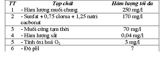 | 1234567 | - Số lượng vi khuẩn - Vi khuẩn đường ruột- Chất khô- Độ cứng chung của nước- Độ đục (theo hàm lượng chất lơ lửng)- Hàm lượng sắt- Độ pH | 100 con/ml3 con/l01 g/l7 mg/l1,5mg/l0,3mg/l6,5-9,5 |